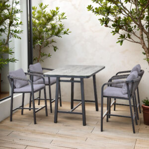The BREZZA furniture set is a unique option for those who want to bring a modern, clubby atmosphere to their garden, terrace, or patio. This exclusive set features a design unusual for garden furniture – it consists of a tall bar table and four comfortable bar stool chairs. It’s the perfect solution for celebrating summer evenings with drinks, snacks, or casual conversations with friends.