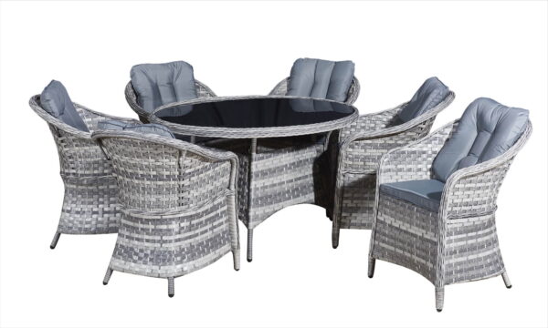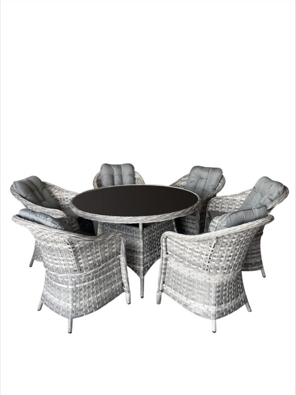 Dark gray seat cushions included in the price of the set (6 pcs). All of them have removable covers made of waterproof material (100% polyester) that can be washed at low temperatures. The pillowcases are made of high-quality fabric coated with Teflon, which protects them against moisture. The pillow filling is made of high-quality upholstery foam (medium hard – T25), which prevents deformation. Pillows thickness: 5 cm.