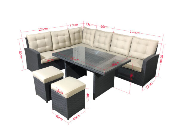 Seat and backrest cushions included in the price of the set (8 pcs. for seats, 7 pcs. for backrests).